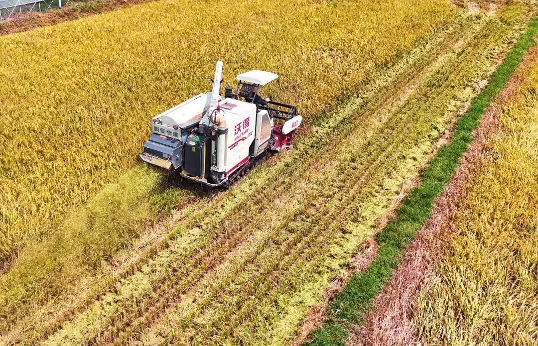 收割机在团洲乡的田野里抢收早稻