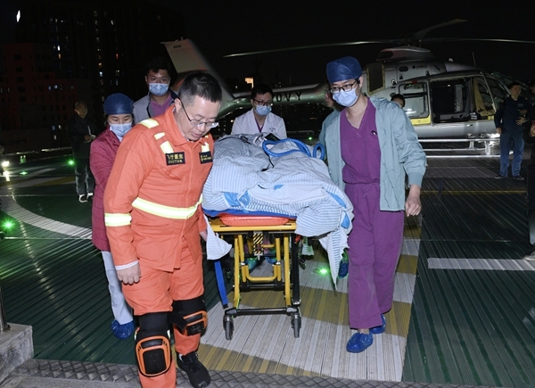 当日下午13时40分,湘雅二医院接获转运任务,立即启动航空医疗转运程序,社会事务部、医务部、心血管外科、麻醉科、手术部等多部门迅速联动,组成空中转运与救治MDT团队。经综合评估患者状况、天气条件及空中航路后,确定启用医疗救援直升机实施转运。15时48分,搭载着经验丰富的医护转运小组的直升机从医院起飞。17时55分,抵达患者所在地后,医护团队迅速完成病情交接和空中转运准备,将患者稳妥安置于机载ICU单元,全程严密监护生命体征。20时50分,直升机平稳降落在湘雅二医院高架直升机场,地面急救团队无缝衔接,将患者通过绿色通道迅速送入手术室。