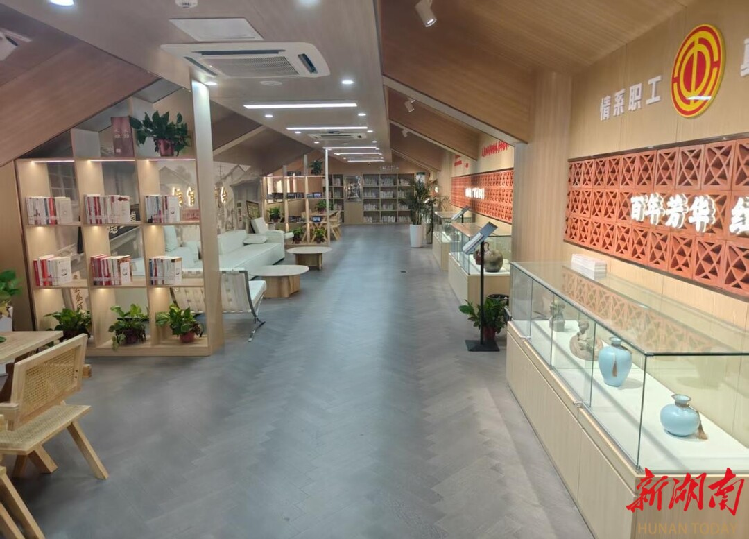 场馆规划包含图书陈列区、综合活动区、阅读休闲区及红色剧本杀体验区等多个功能空间。书架与书柜以创意造型布局,馆藏图书5000余册,不仅涵盖长沙图书馆调配书籍,还收藏了大量铜官地方文献以及诸多作者亲笔签名作品。