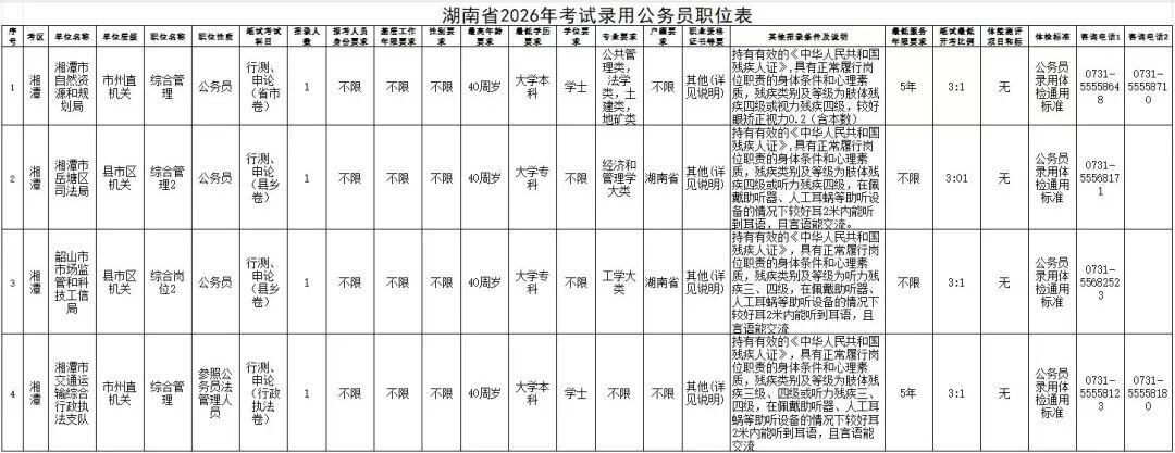 湖南省公务员局日前发布《湖南省2026年考试录用公务员公告》。全省各级机关共计划招录公务员7080名,共定向招录59名残疾人。其中,湖南省省直单位有湖南省广播电视局、湖南省机关事务管理局、湖南省工商业联合会等10个单位定向招录残疾人。