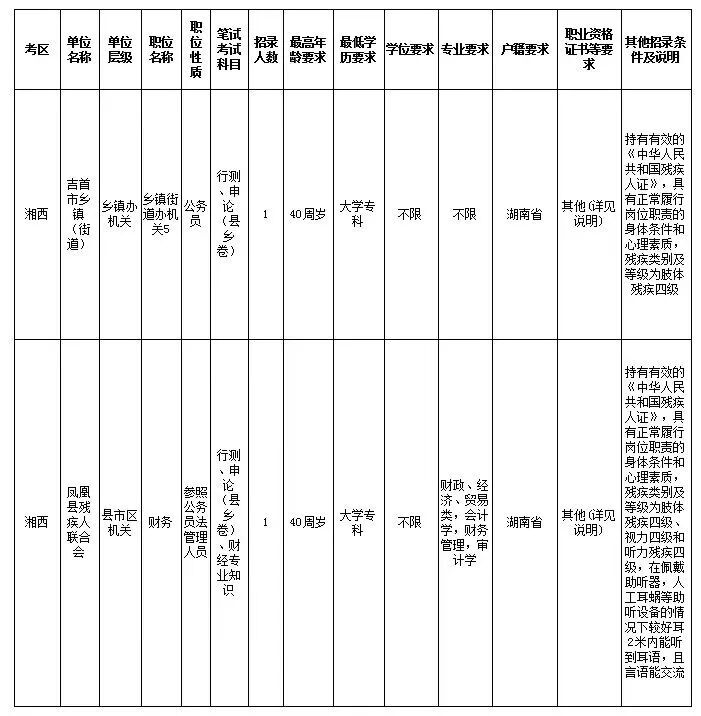 湘西州有两个单位面向残疾人招录,分别是吉首市乡镇、凤凰县残联。