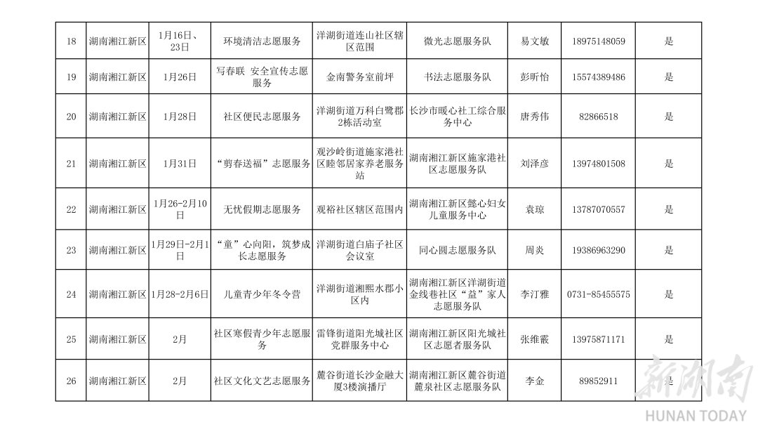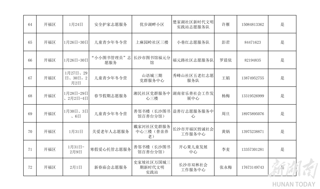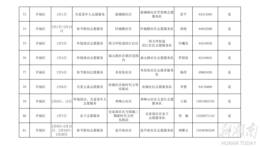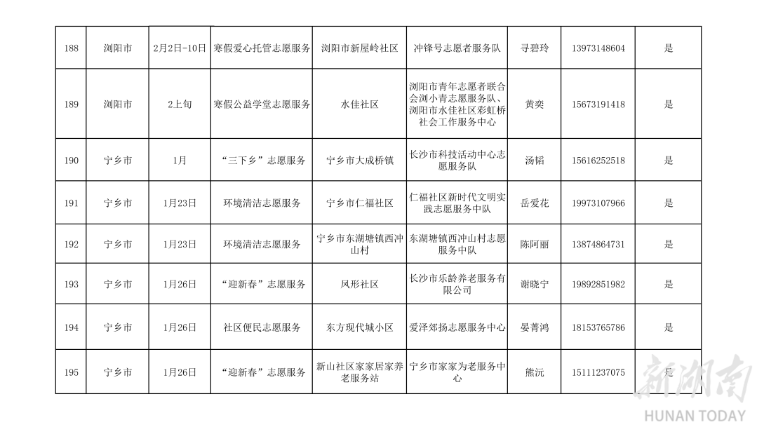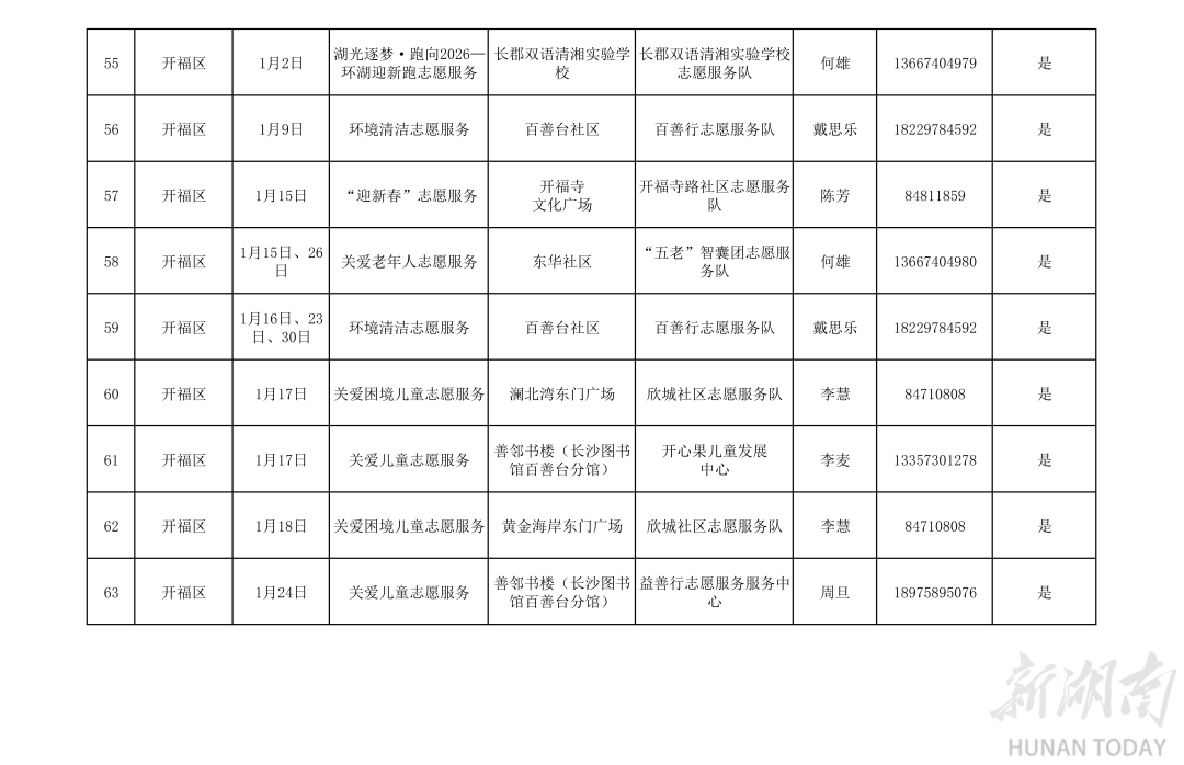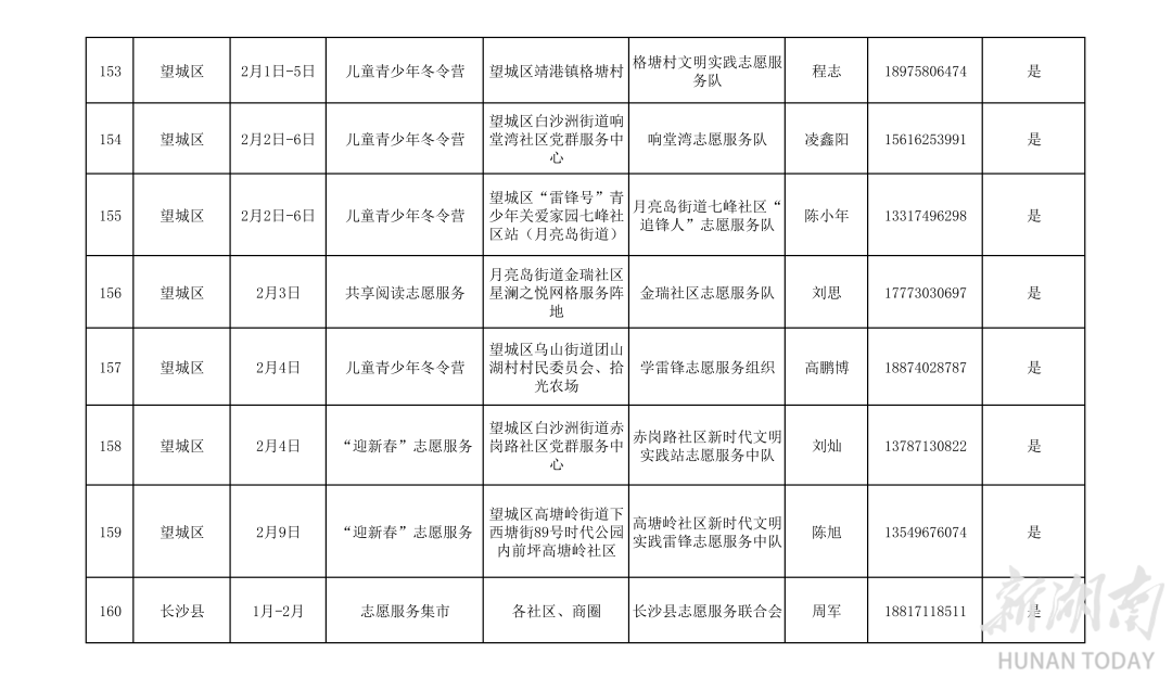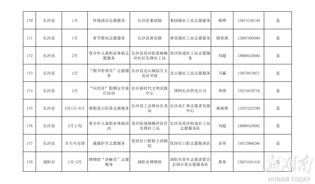 据相关负责人介绍,本次征集活动得到了全市相关单位、组织的积极响应,包括地质灾害和森林火灾隐患排查、春运志愿服务、文明旅游宣传、环境清洁、关爱老年人和困难群体、儿童青少年冬令营等。记者了解到,这些志愿服务岗位涵盖长沙市6区1县2市,既有面向高校学生的实践岗位,也有适合社区居民参与的便民服务项目。有意参与的市民可通过以下表格查询具体岗位信息并报名。
