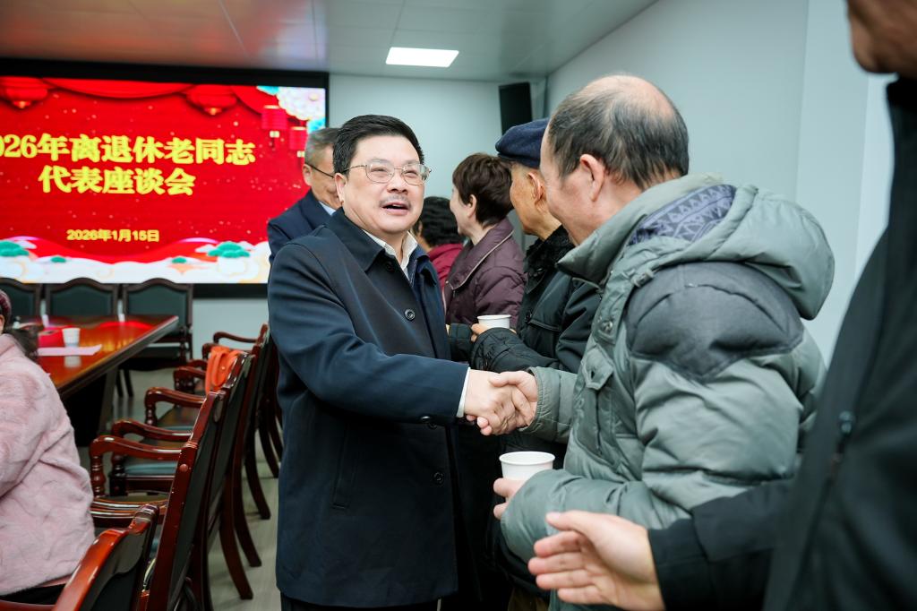 1月15日上午,湖南中医药大学举行2026年离退休老同志代表座谈会。校党委书记戴爱国,校长易刚强,党委副书记汤文胜,离退休处及各相关职能部门、学院相关负责人与老同志代表近80人齐聚一堂,共话发展。座谈会由汤文胜主持。