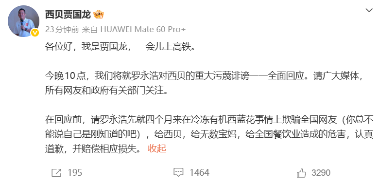 今晚10点,我们将就罗永浩对西贝的重大污蔑诽谤一一全面回应。请广大媒体,所有网友和政府有关部门关注。