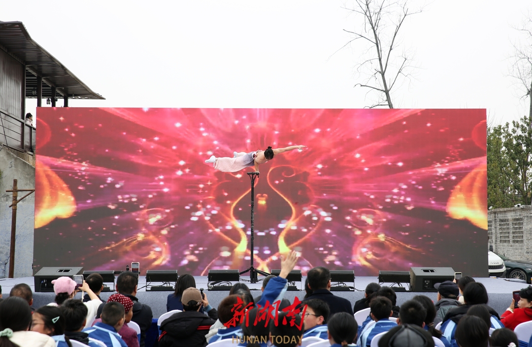 舞蹈《绽放》拉开了演出的序幕,木偶戏《虞美人》、花鼓戏《刘海砍樵》、歌曲《云水山晓》、京剧《咏梅》、杂技《太空漫步》、湘剧《三岔口》、阿卡贝拉《浏阳河》、戏曲特技《变脸迎财神》、歌舞《领航》等节目轮番上演,吸引众多周边百姓围观。座椅上、台阶上、山坡上,都是专注观看演出的身影。
