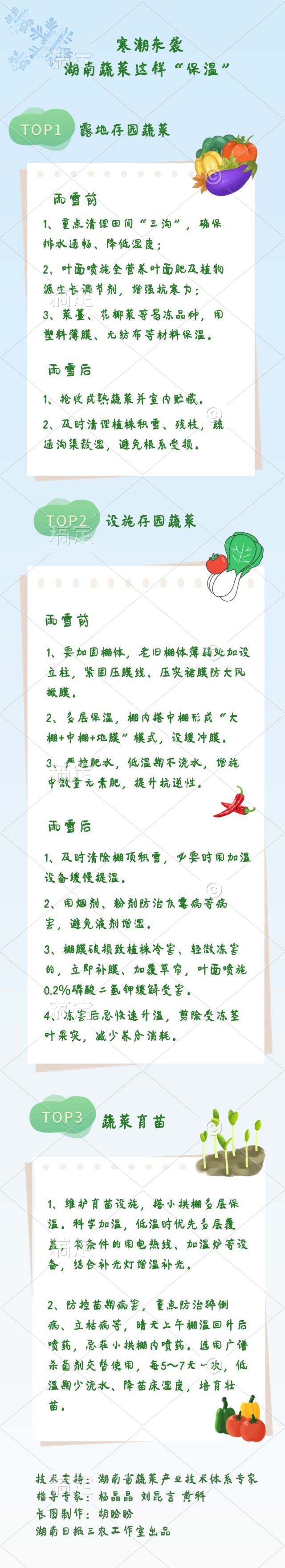 湖南日报1月16日讯(全媒体记者 胡盼盼 通讯员 杨晶晶 刘昆言 黄科)湖南首场寒潮及低温雨雪冰冻天气将于19日来袭。当前正值冬季蔬菜生产和早春茄果类育苗关键期,为减轻冻害、棚体损毁等损失,湖南省蔬菜产业技术体系专家制定以下应对措施,供菜农参考。