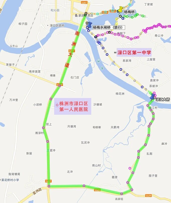 建议通过S207(和城国际至渌水大桥一桥方向)—S329(三斗冲十字路口向东)—X301(百竹村至横江村方向)—渌江大桥(老桥)、松西子