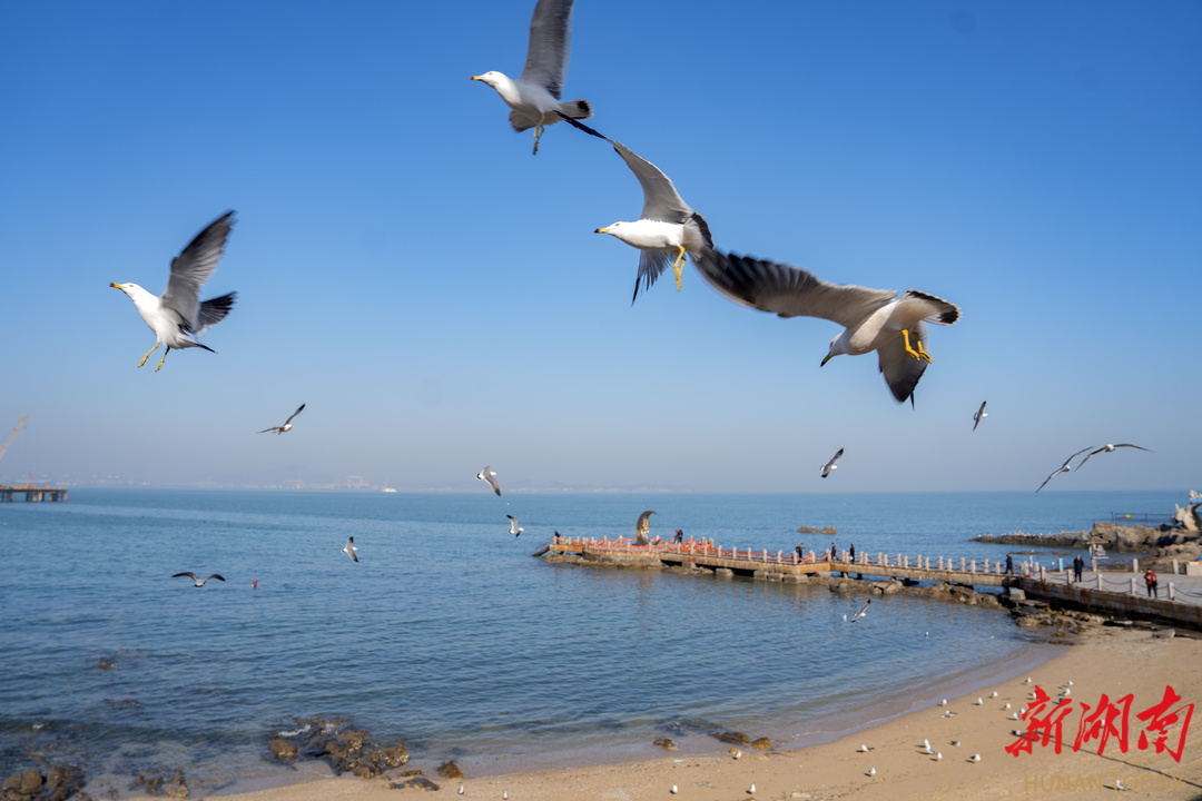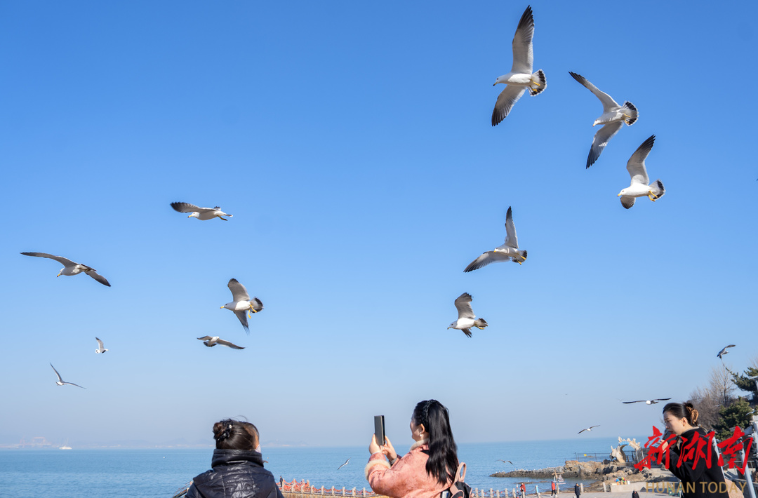1月15日,山东省烟台市海滨,成群海鸥在空中盘旋,与岸边喂食的游客近距离互动,成为冬日里鲜活的风景线。 湖南日报全媒体记者 李健 摄
