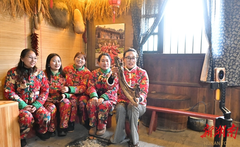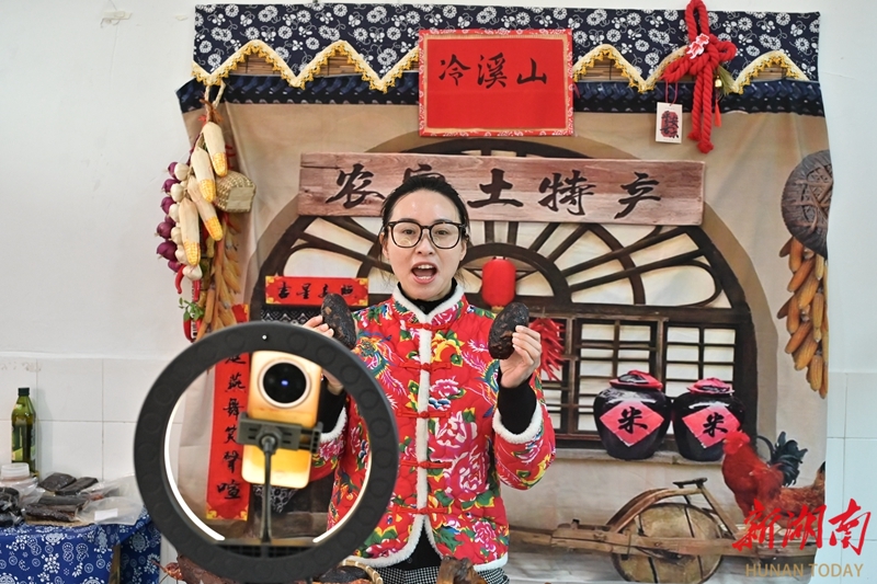 1月15日,隆回县金石桥镇冷溪山村,“金花播主”在直播推介猪血丸子。该村妇女采取“传帮带”培育主播团队,利用直播带货,将土特产销往全国,开辟山货销售新渠道,有效带动了村民增收,为乡村振兴注入新活力。贺上升 摄(湖南图片库)