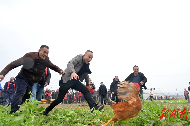 1月16日,双峰县洪山殿镇金桥村,游客在参加趣味捉鸡游戏。当天,金桥村贤才果蔬基地举办杀年猪体验活动。游客们参与捉鸡、摸鱼等农趣体验,共享杀猪饭,感受浓浓乡村年味。李建新 谢姣如 摄影报道(湖南图片库)