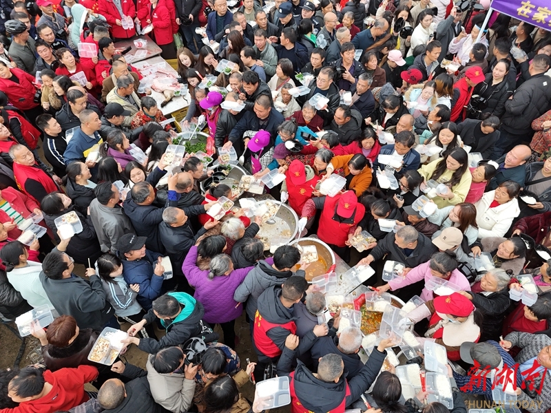 1月16日,双峰县洪山殿镇金桥村,游客排队品尝杀猪饭。当天,金桥村贤才果蔬基地举办杀年猪体验活动。游客们参与捉鸡、摸鱼等农趣体验,共享杀猪饭,感受浓浓乡村年味。李建新 谢姣如 摄影报道(湖南图片库)