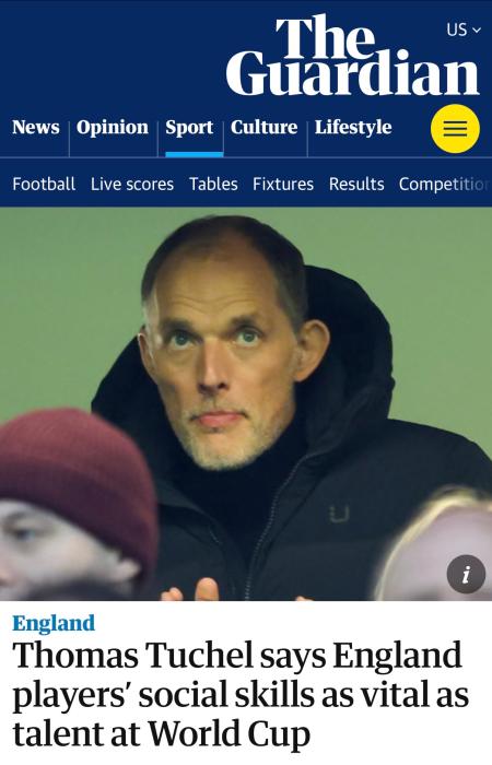 据报道,图赫尔将在决定26人大名单之前考察球员之间的互动。“当球员们觉得队内氛围是积极的,他们了解自己的角色,为什么在这里,对他们的期望是什么,他们乐意在赛事期间或更长的时间里待在一起,那他们就成功了。”