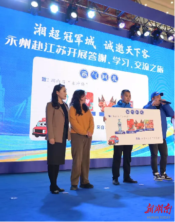 新湖南客户端1月17日讯(记者 张云龙)当永州“湘超”冠军的欢呼余音未散,金陵新街口的蓝色灯光已然点亮;当道州脐橙的清甜跨越千里,宿迁美酒与特产便载着热忱奔赴潇湘。1月16日,2026年CMG群众足球邀请赛(湖南永州)赛事打响前夕,洋河股份以15999瓶第七代海之蓝小酒馈赠球迷,与消费者共同唱响“蓝色力量”。