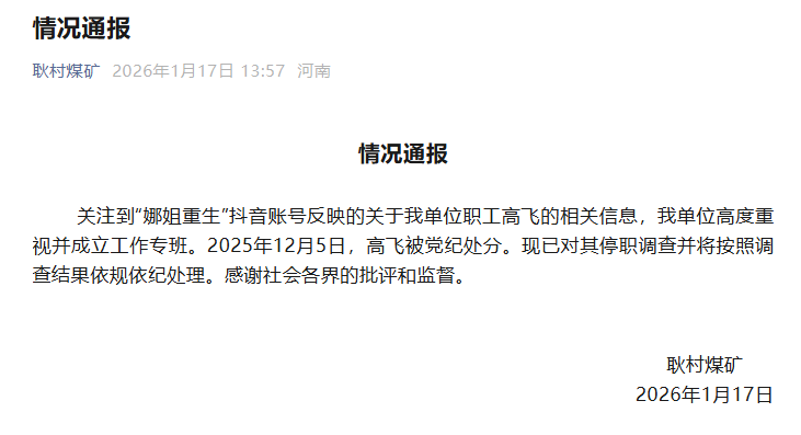 关注到“娜姐重生”抖音账号反映的关于我单位职工高飞的相关信息,我单位高度重视并成立工作专班。2025年12月5日,高飞被党纪处分。现已对其停职调查并将按照调查结果依规依纪处理。感谢社会各界的批评和监督。