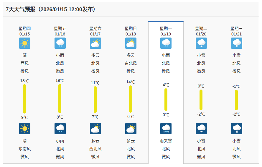 下周一(19日)达到气温低谷,预报显示当天可能有雨夹雪,最高气温骤降至4℃左右,最低气温0℃。