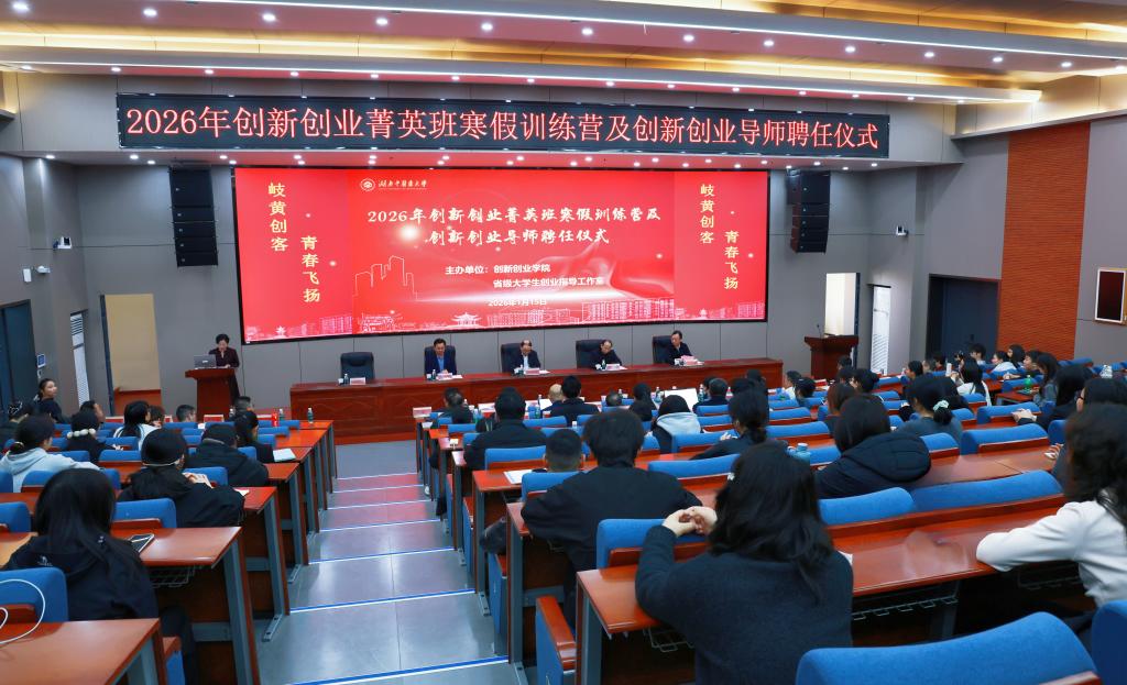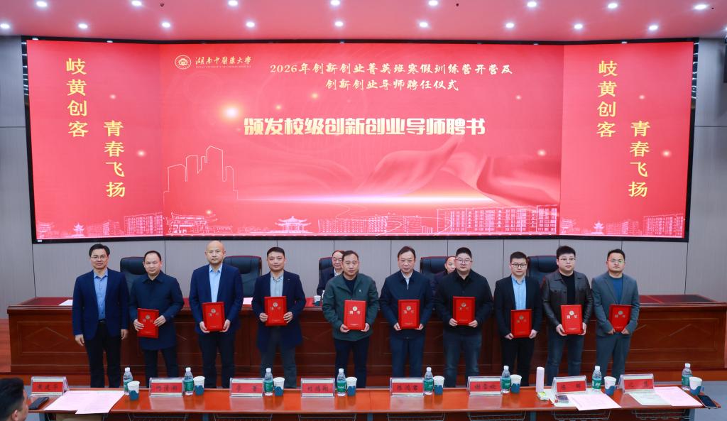 厚植创新沃土,汇聚创业菁英,1月15日上午,湖南中医药大学举行2026年创新创业菁英班寒假训练营开营暨创新创业导师聘任仪式。副校长刘鸿翔、廖菁,纪委书记陈鸿君出席活动。40位新聘创新创业导师、支持大学生创业企业代表以及师生代表共同参与。