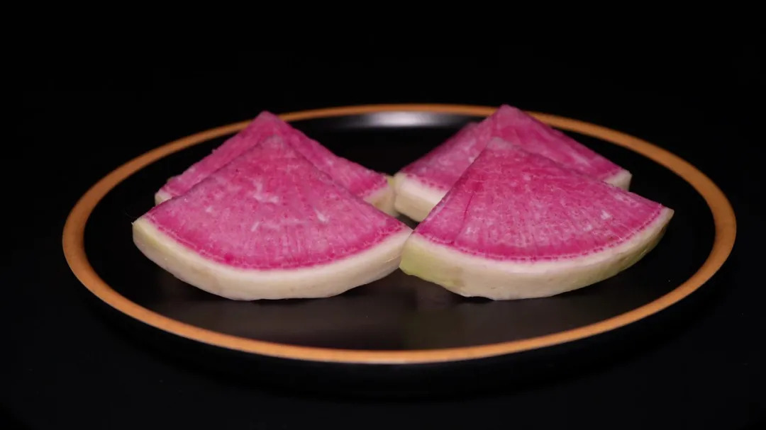红皮白肉萝卜,又叫水萝卜,卞萝卜,最常见的有“樱桃萝卜”,更是餐桌上的“颜值担当”。它的肉质比白萝卜更紧实,辣味也更浓,这得益于其含有的挥发性风味物质[6]。