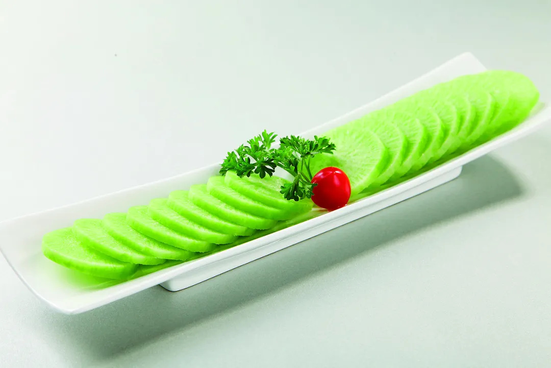 绿皮红肉的心里美、满堂红,以其翠绿的外皮和鲜红脆嫩的果肉而得名,北京经典凉菜 “拌心里美” 就是用它制作的 —— 切成细丝后用糖醋调味,酸甜爽口,色彩诱人。