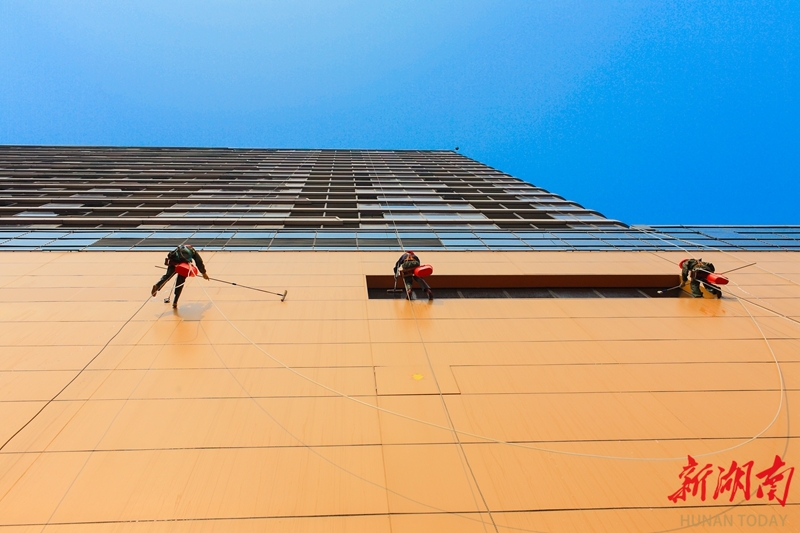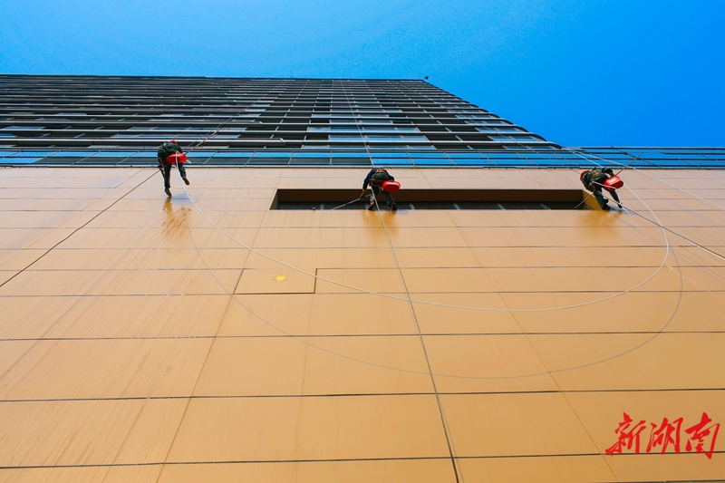 1月16日,吉首市,高空保洁工人借助专业绳索,对高楼大厦的玻璃幕墙进行清洁作业。这些悬于高空的作业人员如同“蜘蛛侠”,在擦亮城市建筑的同时,成为一道独特的“风景线”。石雪源 杨艳萍 摄影报道(湖南图片库)