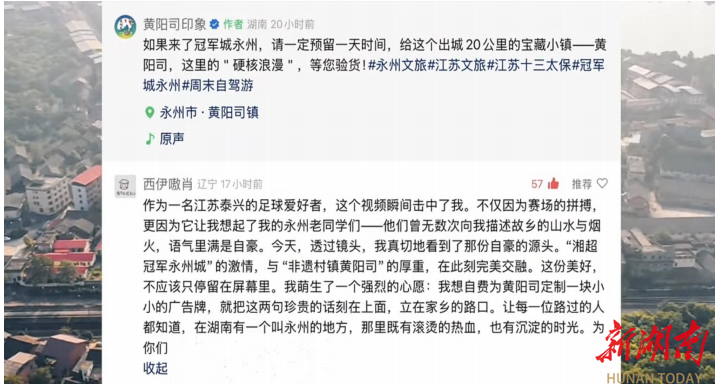 近日,一段展现永州市冷水滩区黄阳司镇非遗风情的短视频,跨越千里,深深打动江苏省泰州市泰兴市一位热心网友。为此,这位网友特意定制了一块写有“湘超冠军永州城,非遗村镇黄阳司”的广告牌赠予黄阳司镇。这份来自“江苏足球之乡”的珍贵情谊,不仅为“苏永”民间交流添上一段佳话,更如一束聚光灯,将外界的目光引向了这片充满生机与潜力的“湖南民间文化艺术之乡”。