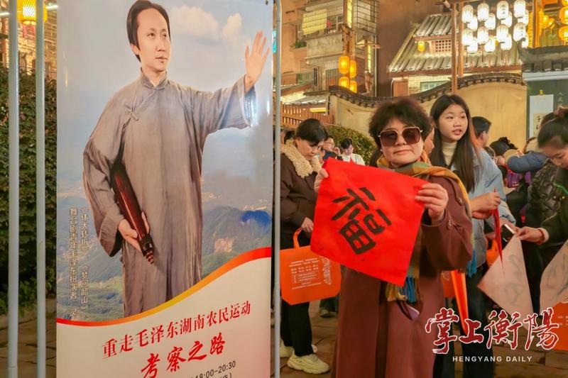 当晚的活动现场,特型演员王俊杰身着特色服饰,生动再现毛泽东同志的风采。游客与群众自发紧随其后,在导游的深情讲解中,循着先辈足迹游览衡山渡街区与农民运动纪念馆旧址康王庙,重温那段波澜壮阔的红色岁月。