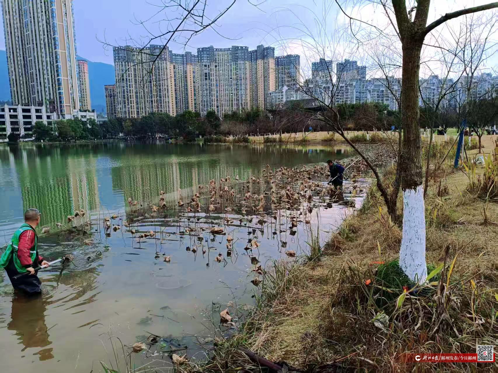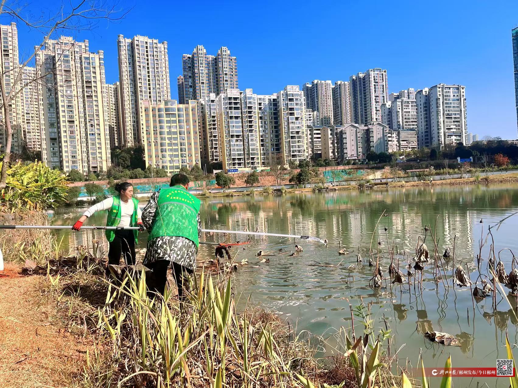 近日,郴州市园林绿化服务中心组织工作人员在爱莲湖水域开展集中清荷行动,对湖中的干枯荷叶、残枝进行全面清理,为市民游客营造更整洁、安全的游园环境。