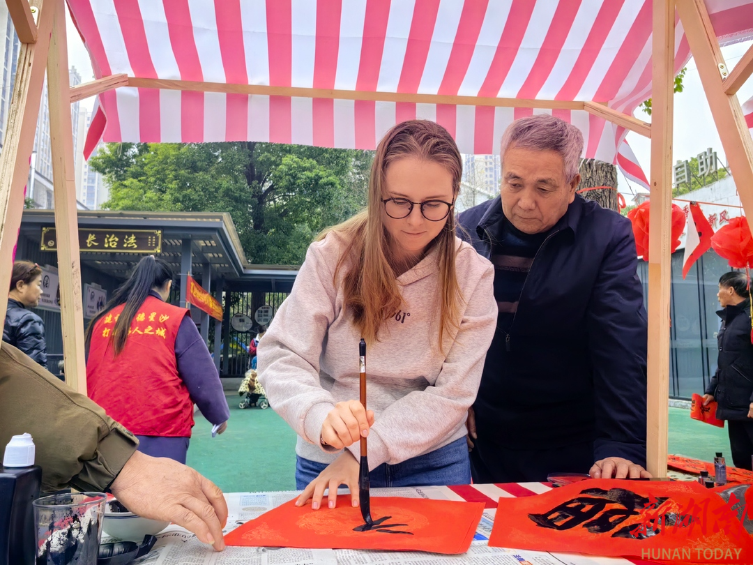 在春联创作区,书法爱好者挥毫泼墨,一副副春联、一个个“福”字渐次铺开,居民们有序排队领取。人群中,来自俄罗斯的工程师拉祖姆内·帕维尔和翻译埃列米娜·奥尔加正聚精会神驻足观看。