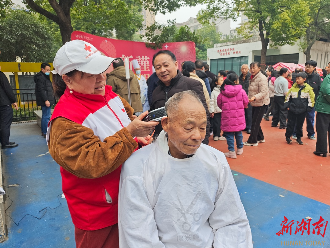 “湖南好人”许冬花(左一)正在为居民理发。