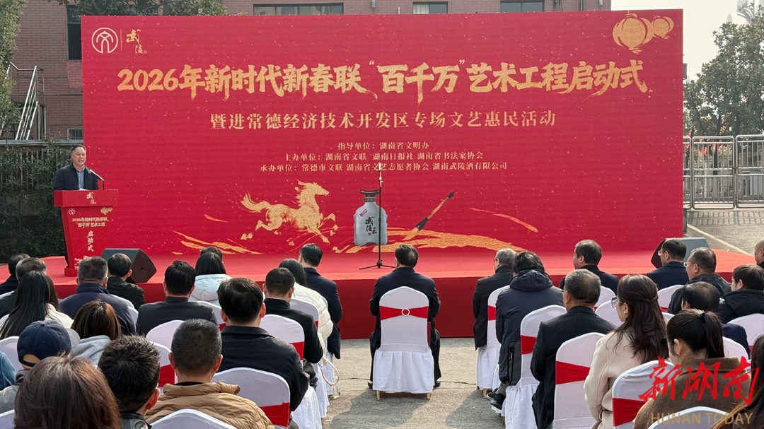 湖南日报·新湖南客户端1月18日讯(记者 李杰)为推动中华优秀传统文化创造性转化与创新性发展,积极担负新时代文化使命,营造欢乐祥和、崇德向善的新春氛围,将党的温暖与关怀送至基层一线,1月17日,2026年新时代新春联“百千万”艺术工程启动式暨进常德经济技术开发区专场文艺惠民活动在常德举行。此次活动不仅标志着年度“百千万”新春联艺术惠民工程正式启航,更是一次文化深入产业园区、艺术服务实体经济、传统佳节与企业文化交融互鉴的生动实践。
