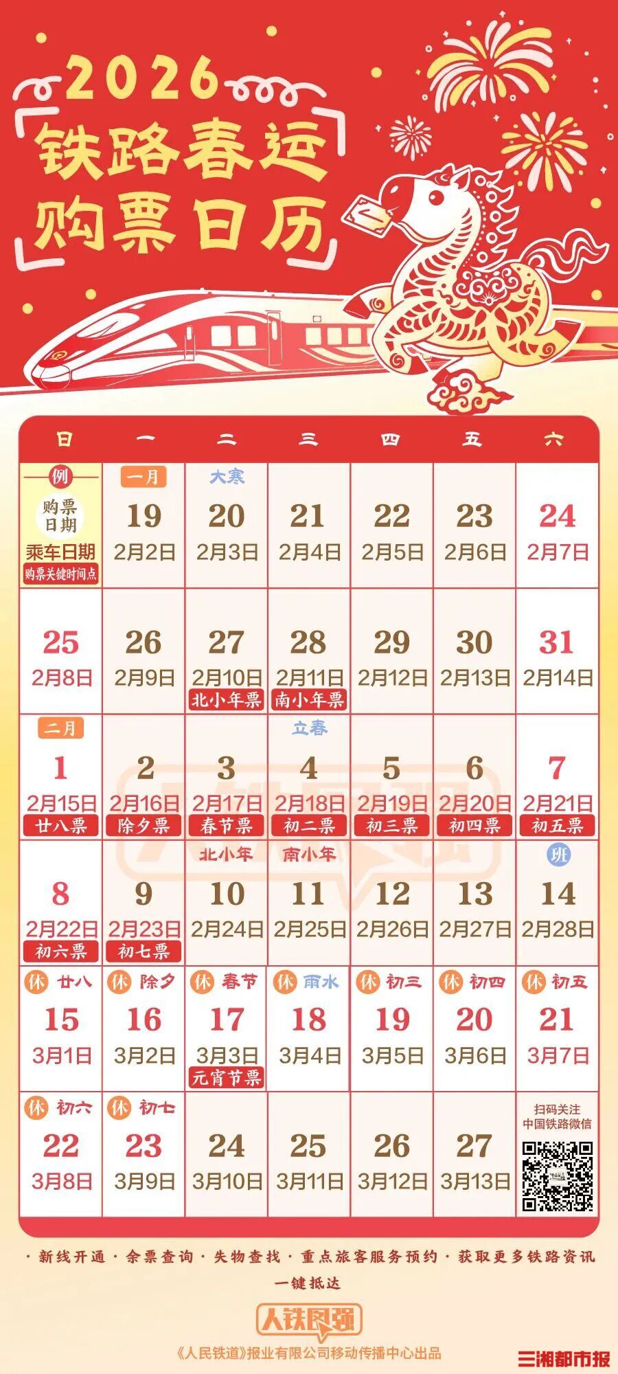 三湘都市报·新湖南客户端1月18日讯(全媒体记者 李致远 整理)1月18日,据国铁集团消息,2026年铁路春运自2月2日开始,至3月13日结束,为期40天,全国铁路预计发送旅客5.39亿人次、同比增长5.0%,节前客流高峰日预计为2月13日(腊月廿六),节后客流高峰日预计为2月23日(正月初七),春运首日火车票将于1月19日开始发售。