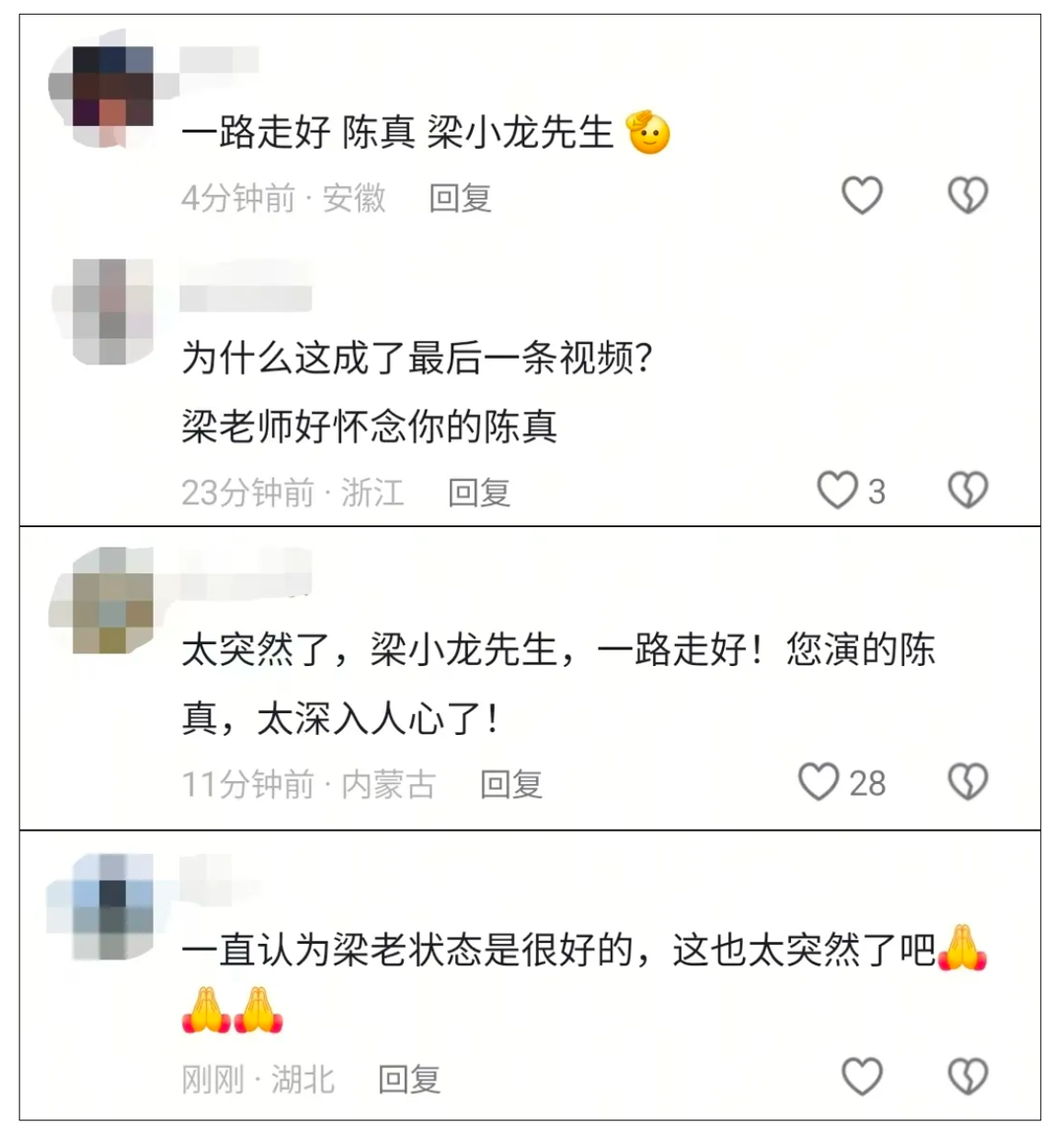 近年来,梁小龙长居内地,活跃于抖音、小红书等社交平台,经常分享生活日常、功夫心得,以及与朋友聚会的欢乐时光,深受粉丝喜爱。在他离世的消息传出后,许多网友在其账号下留言悼念: