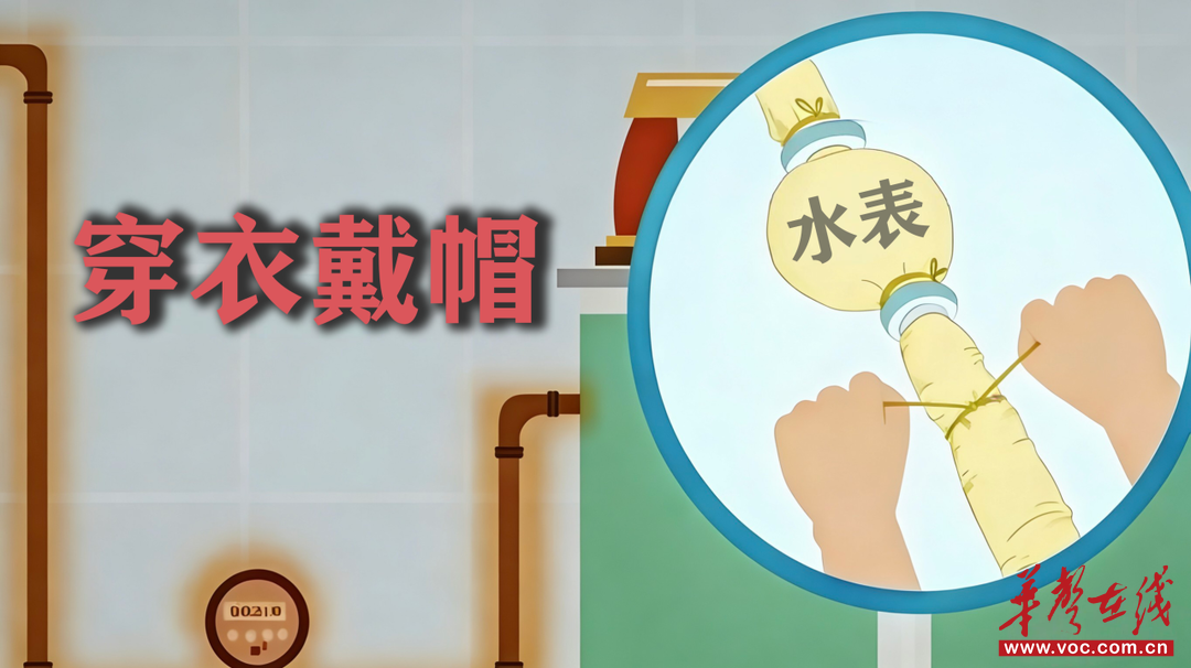 对于安装在室外的水表及水管可以选用厚实的毛巾或布块等保温材料包裹;冬季长期空置房间应将水表前的阀门关闭,打开水龙头,排空管道内的自来水;如果水表已经被冻住,用热毛巾包在水表上,用不超过60摄氏度的温水浇洒,切勿浇沸水、用火烘烤,防止水表损坏;如遇严重冰冻天气,用户在采取防冻措施的同时,可提前蓄水备水,以保障突发性冻管爆管后的基本用水。