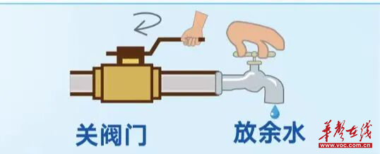 4、排空措施:长期离家必做。如果长期不在家,请您在离家之前将水表旁的进水阀门关闭,再排空管道内的余水;家里装有太阳能的,也要记得排空设备内的水,以防用水设施冻破造成不必要的损失。