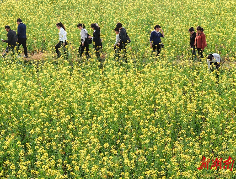 1月17日,道县清塘镇楼田村,人们在菜花田里游玩。当天是周末,天气晴好,该村蔬菜基地盛开的菜花吸引不少游客前来,在暖阳下尽享田园休闲时光。 蒋克青 摄(湖南图片库)