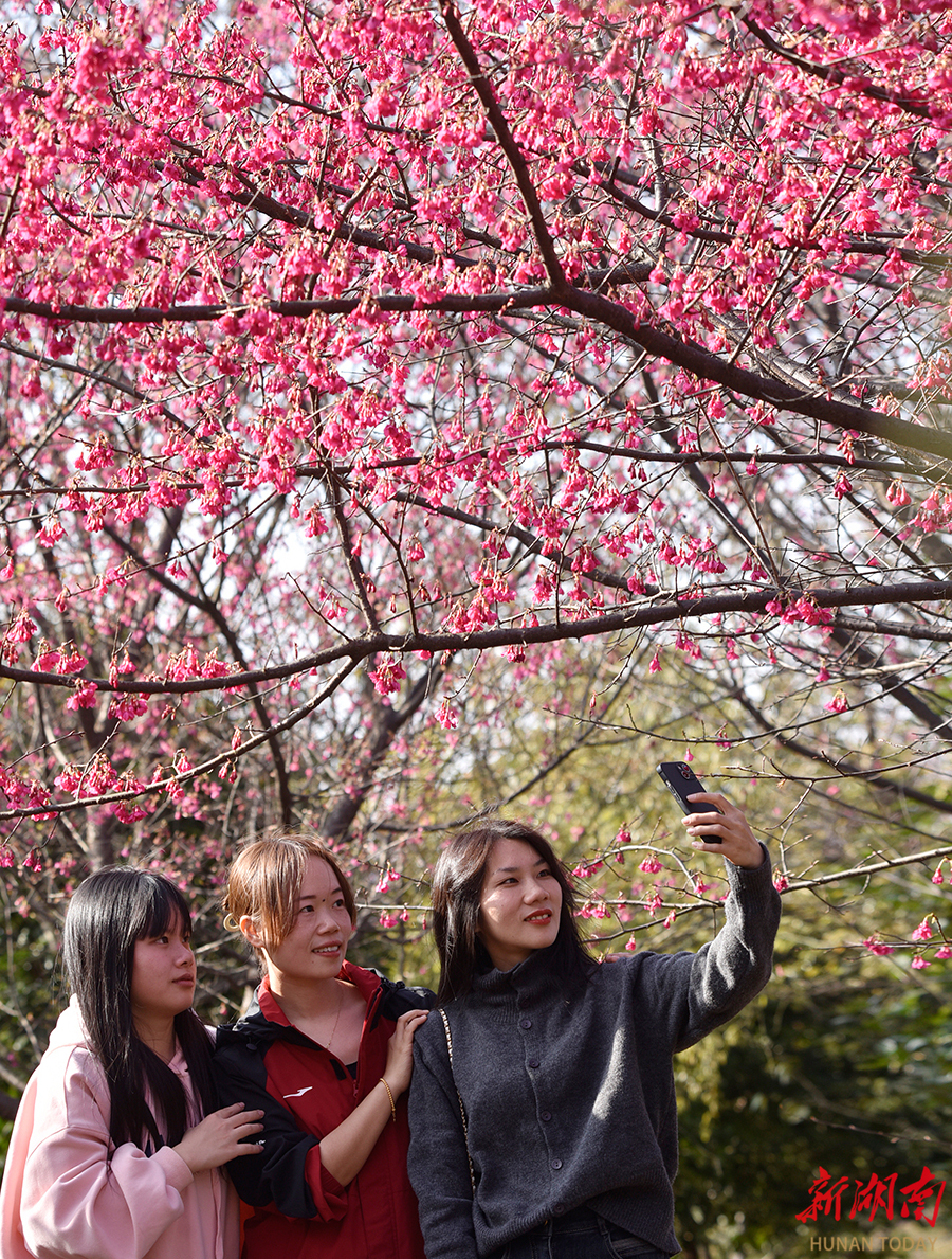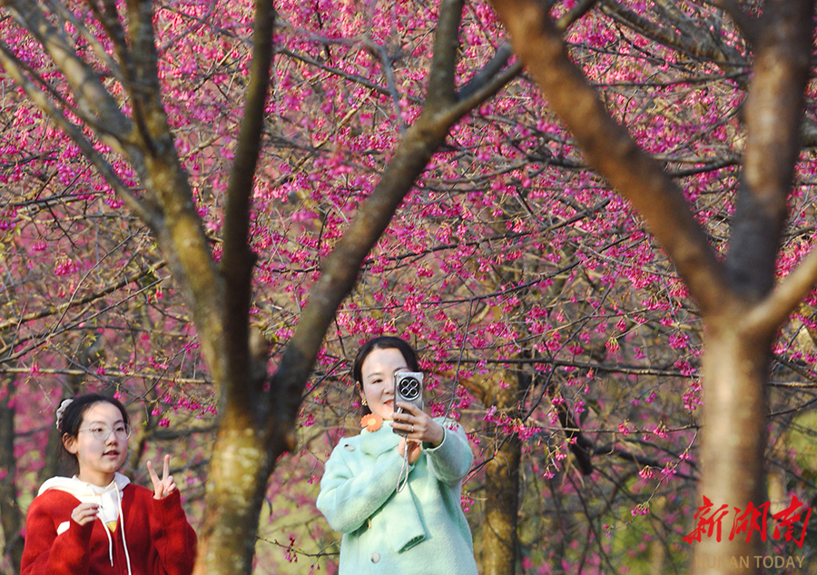 1月18日,嘉禾县龙潭镇扶塘村,游客在樱花树下休闲游玩。得益于今年的暖冬气候,该村300余亩早樱竞相绽放,花朵缀满枝头,宛如灿烂云霞,构成一幅美丽的冬日乡村画卷。 黄春涛 摄(湖南图片库)