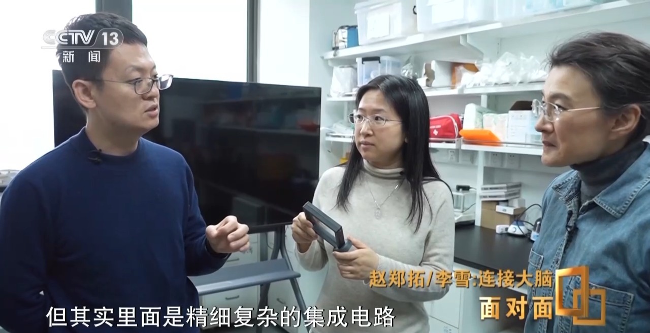 赵郑拓:可能这个看起来,它就是一个纽扣一样的东西,但其实里面是精细复杂的集成电路。我们有大概三颗芯片组成的一个芯片组在处理信息。只有最前端3到5毫米小的尺寸,进入到人的大脑中去,就可以建立起来信息通道。