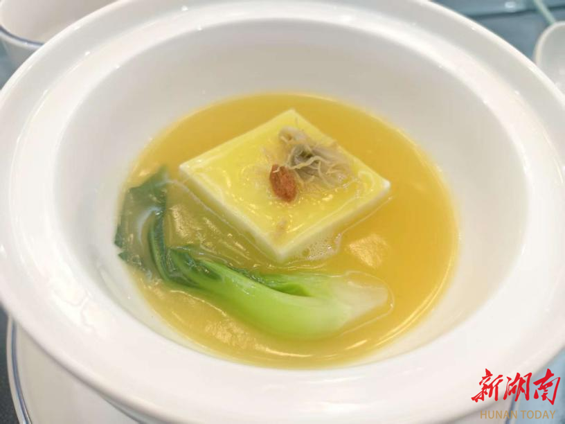 一方嫩豆腐,凝萃食材的本味。畏公豆腐,其名源自谭延闿尊号“畏公”,外表素朴,内藏锦绣乾坤,将“以简驭繁”的匠心发挥到极致。其“精”髓,首先在于汤:须以老母鸡、筒子骨与火腿慢吊出澄澈高汤,奠定鲜醇底蕴。其次在于豆腐:小磨细研去粗皮,过密漏成细茸,再调入草鱼茸、蛋清与鸡汤,调和蒸制。最后以浓汤配干贝丝、火腿丝慢煨入味。
