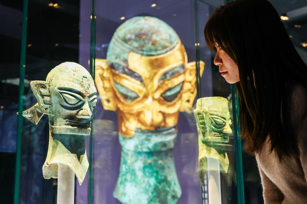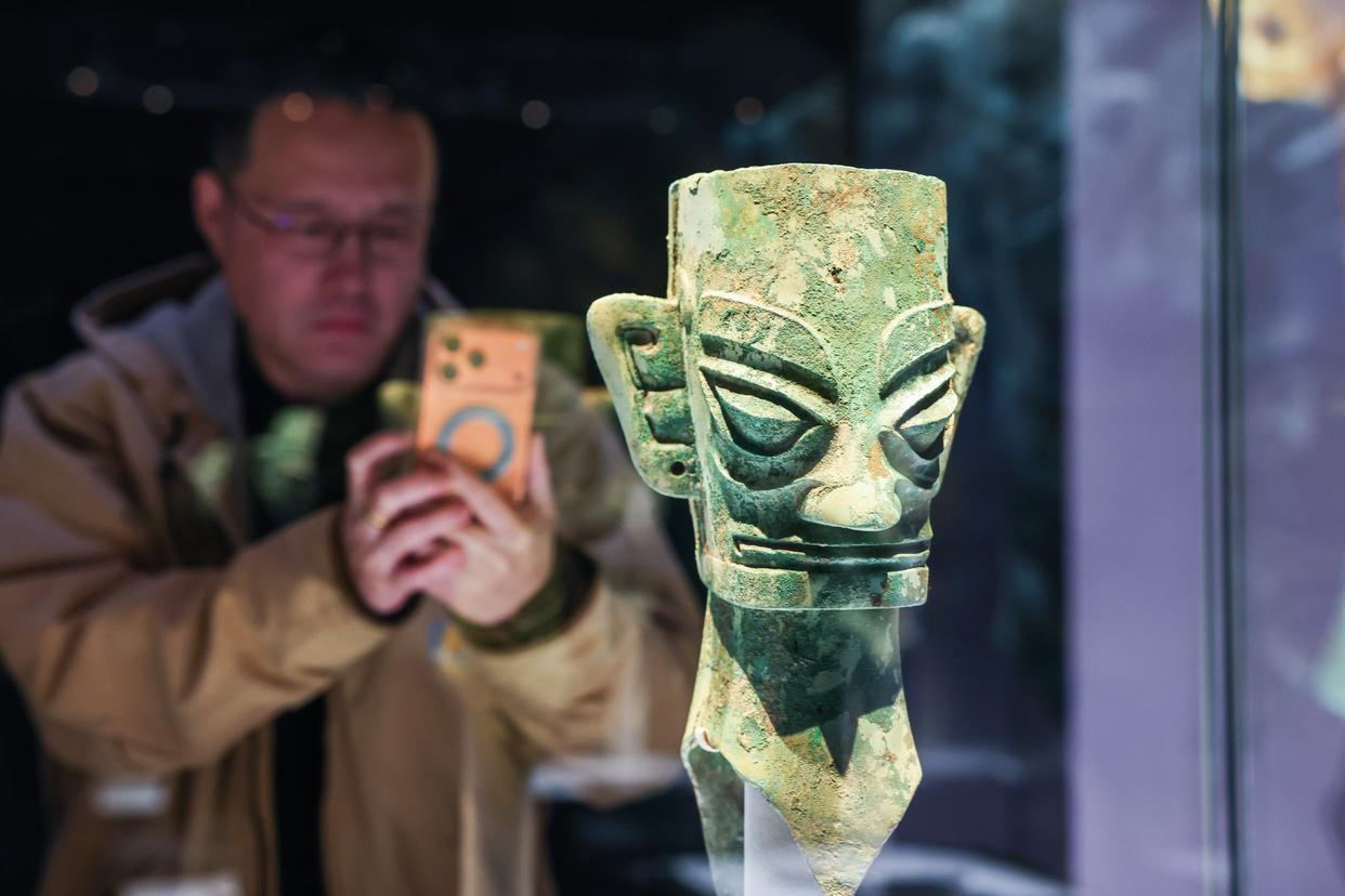 展览还促成了一次时隔40年的聚会。三星堆博物馆藏与国博馆藏的两件戴冠纵目面具并列展出。这是自1986年三星堆祭祀坑发掘以来,两件标志性文物的首次同台亮相。策展人说,恰逢金沙遗址博物馆闭馆实施保护展示提升的契机,在金沙参展的108件(套)文物中,有37件(套)文物自金沙开馆以来从未外展,包括青铜立人、兽首饰玉璋等一批蜚声海内外的标志性器物。太阳神鸟金饰将于“文化和自然遗产日”20周年之际再次在国博展出。这些珍品与三星堆博物馆、四川省文物考古研究院、成都市文物考古研究院的戴金面罩青铜人头像、太阳形青铜器、青铜面具、青铜神兽、青铜爬龙器盖、青铜持鸟立人像、青铜镂空杖形器、象牙等一批重器一同亮相,合力阐释古蜀文明。