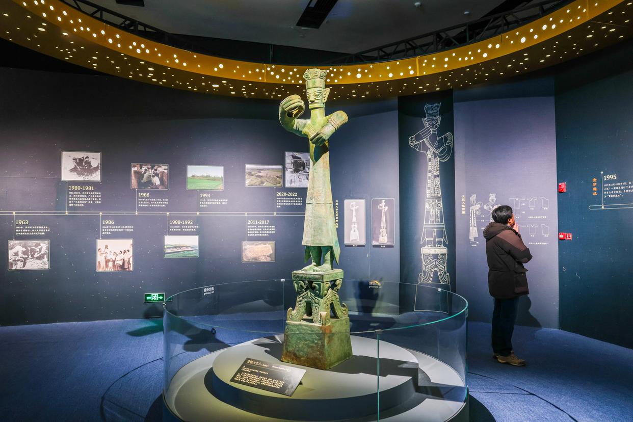 1月18日,为期7个月的“双星耀世——三星堆—金沙遗址古蜀文明展”揭面纱,系统呈现古蜀文明灿烂图景,首次集中展示三星堆与金沙遗址最新考古成果。200余件展品中,一级品达59件,包括青铜立人在内的37件金沙遗址博物馆文物是首次出馆展出。除金面具和太阳神鸟金饰随后到访,戴金面罩青铜人头像等明星展品已悉数就位。