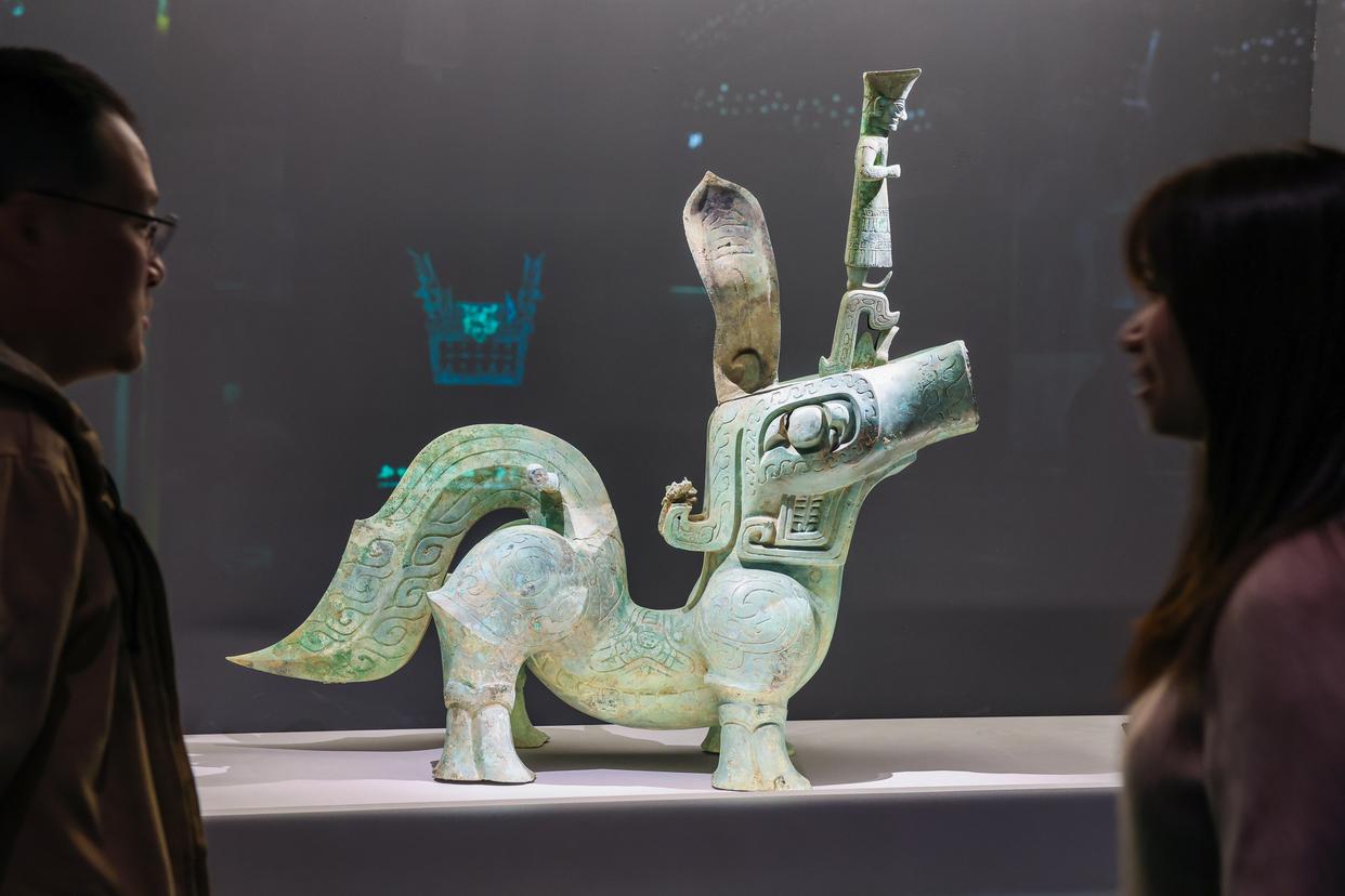 这是一个“相似度”极高的展览,大小不一的青铜人面具、大同小异的青铜眼形器,神鸟、龙蛇、老虎等造型的文物也是扎堆出现。在专家眼里,它们讲述了“传承”的故事。