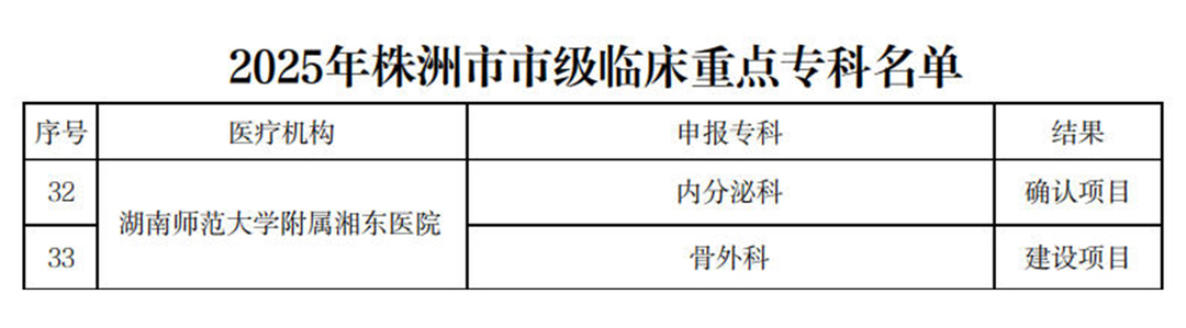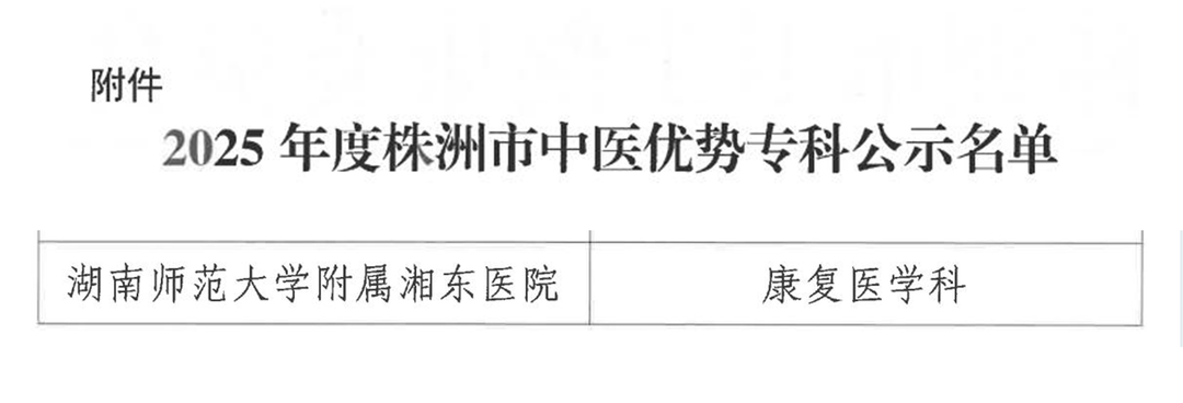 大众卫生报·新湖南客户端1月19日讯(通讯员 徐虹)近日,株洲市卫生健康委员会分别下发了《关于确定2025年度株洲市市级临床重点专科的通知》《关于确定2025年度株洲市中医优势专科的通知》,湖南师范大学附属湘东医院内分泌科获批市级临床重点专科确认项目,骨外科获批市级临床重点专科建设项目,康复医学科获批中医优势专科。