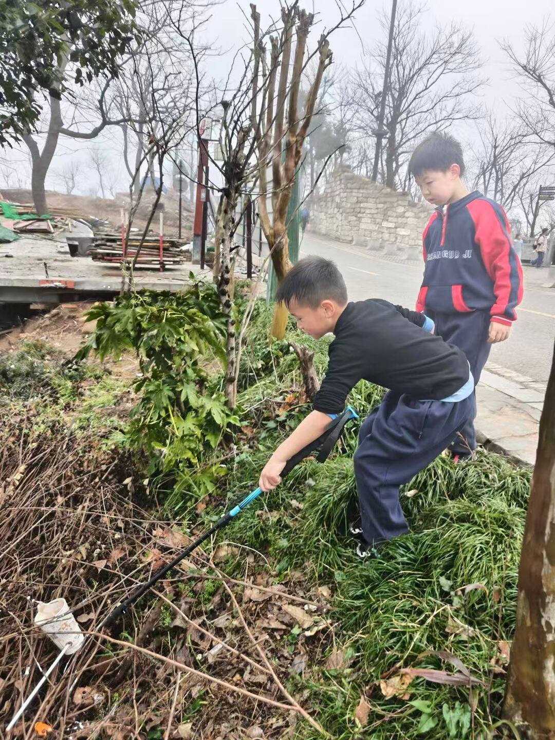 这是该班级首次组织集体登山活动,却远远超出了简单的户外锻炼范畴。活动发起时便明确融入了环保实践与自然教育的内涵。孩子们人手携带一个环保袋,从山脚出发,目光不仅欣赏沿途风光,更细致地搜寻着步道旁、树林间的纸屑、塑料瓶、包装袋等垃圾。他们三五成群,分工合作,有的负责发现,有的负责捡拾,有的负责撑开袋子,小小的身影忙得不亦乐乎。清脆的童声还唱起了《低碳贝贝》等环保歌曲,欢快的歌声与认真的举动,吸引了众多登山市民赞许的目光。