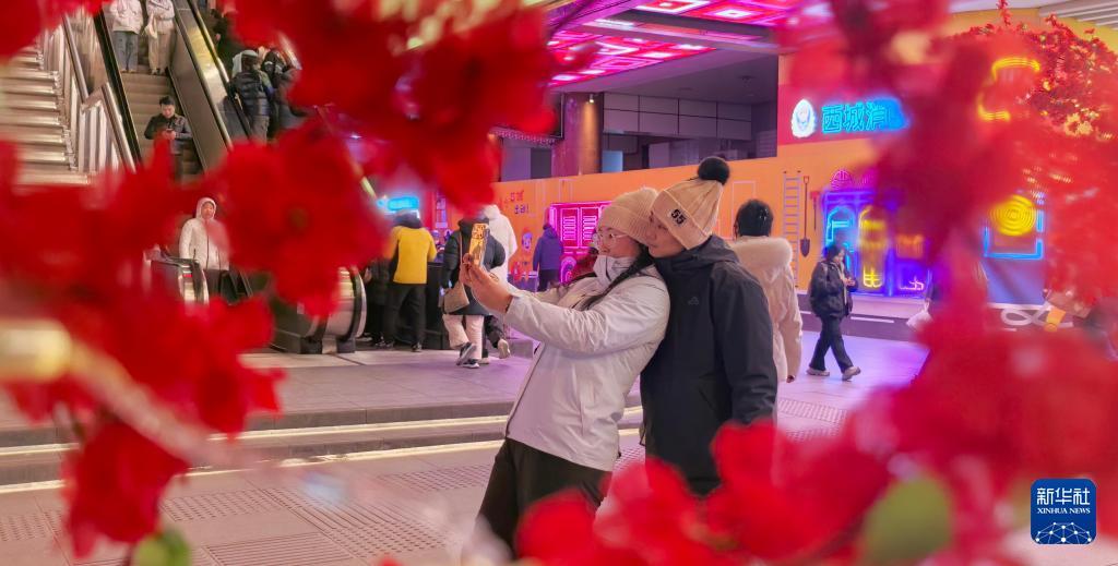 市民在年味浓浓的西单商业街上自拍(1月16日摄)。