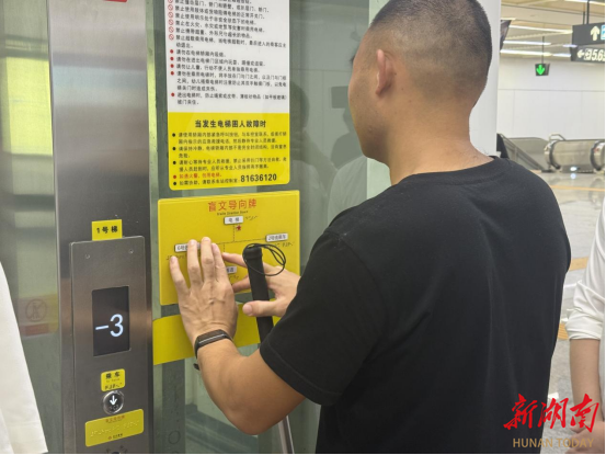 图为商磊正在触摸长沙地铁站的盲文导向牌