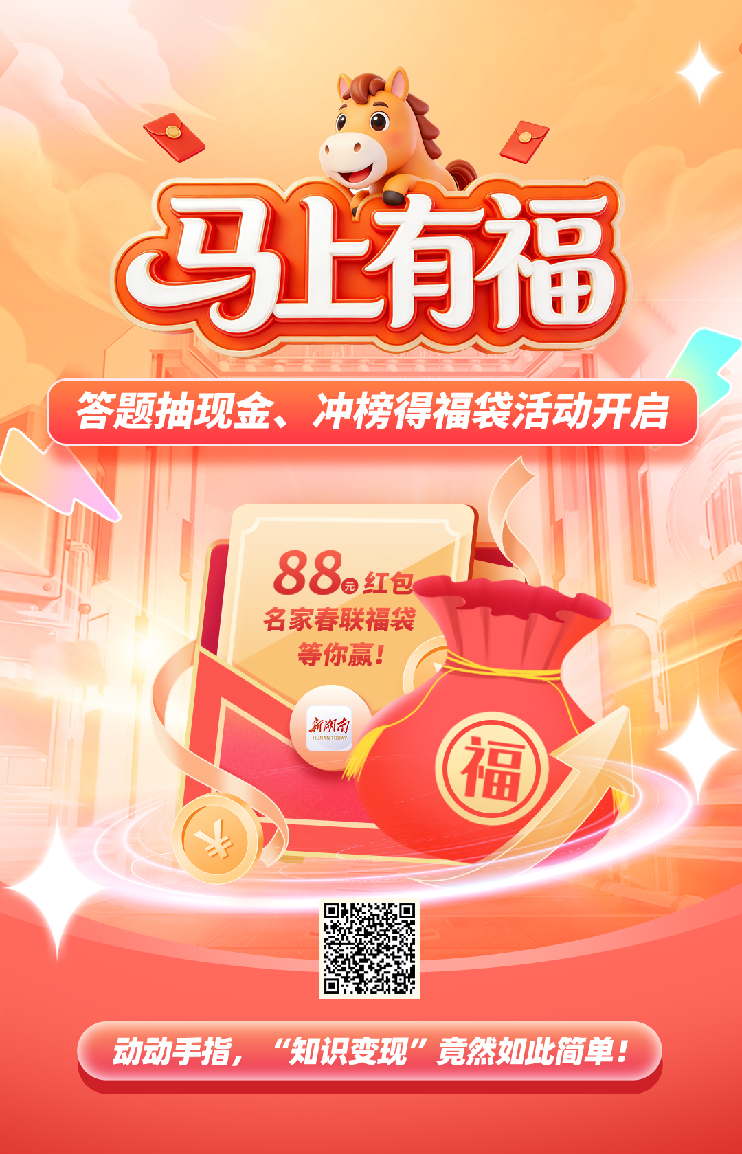 红纸翰墨送雅趣,答题抽奖送真金。目前活动入口已开启,万元红包、名家春联福袋静待主人。赶紧来新湖南客户端,开启你的“马上有福”之旅吧!