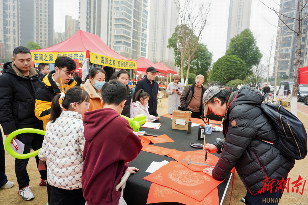 长沙市书法家协会主席杨东平现场给居民们书写春联、福字
