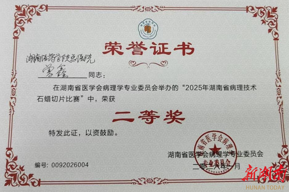 近日,2025年湖南省病理技术石蜡切片比赛现场传来捷报,湖南医药学院总医院病理科技师曾鑫凭借其精湛的专业技能和卓越的综合素质,在全省众多优秀技术能手中脱颖而出,荣获二等奖。