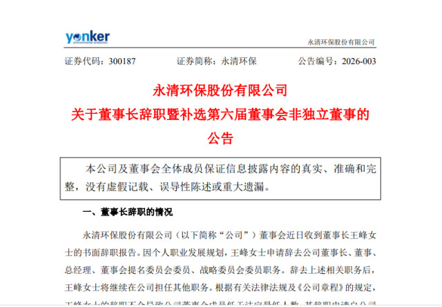 湖南日报1月19日讯(全媒体记者 黄炜信)近日,湘股永清环保发布公告称,永清环保董事长、董事、总经理、董事会提名委员会委员、战略委员会委员王峰女士,因个人原因申请辞去上述全部职务。
