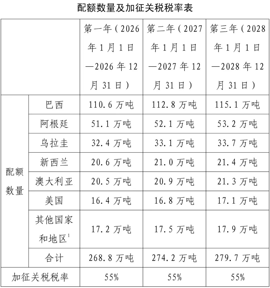 2026年元旦起,商务部2024年第60号公告正式生效,对进口牛肉实施“国别配额+配额外加征关税”的三年保障措施。