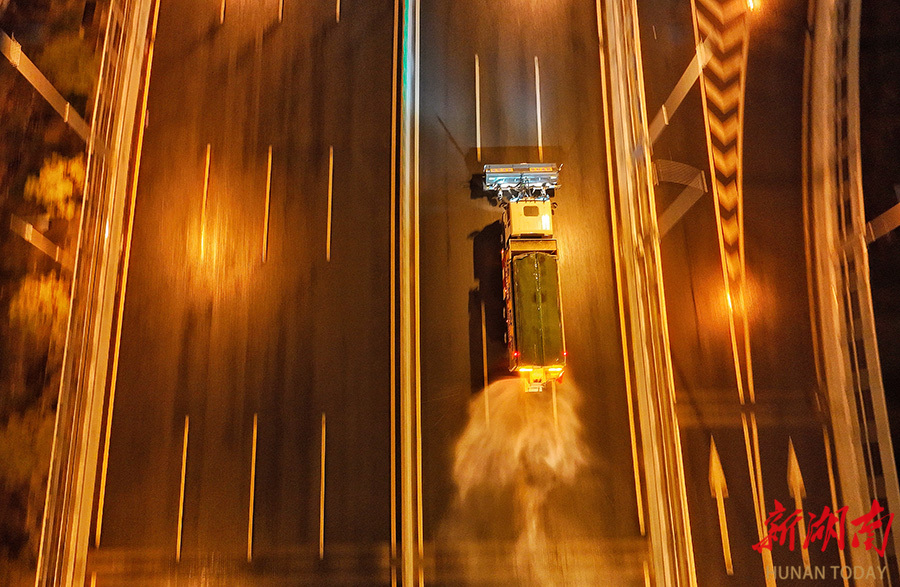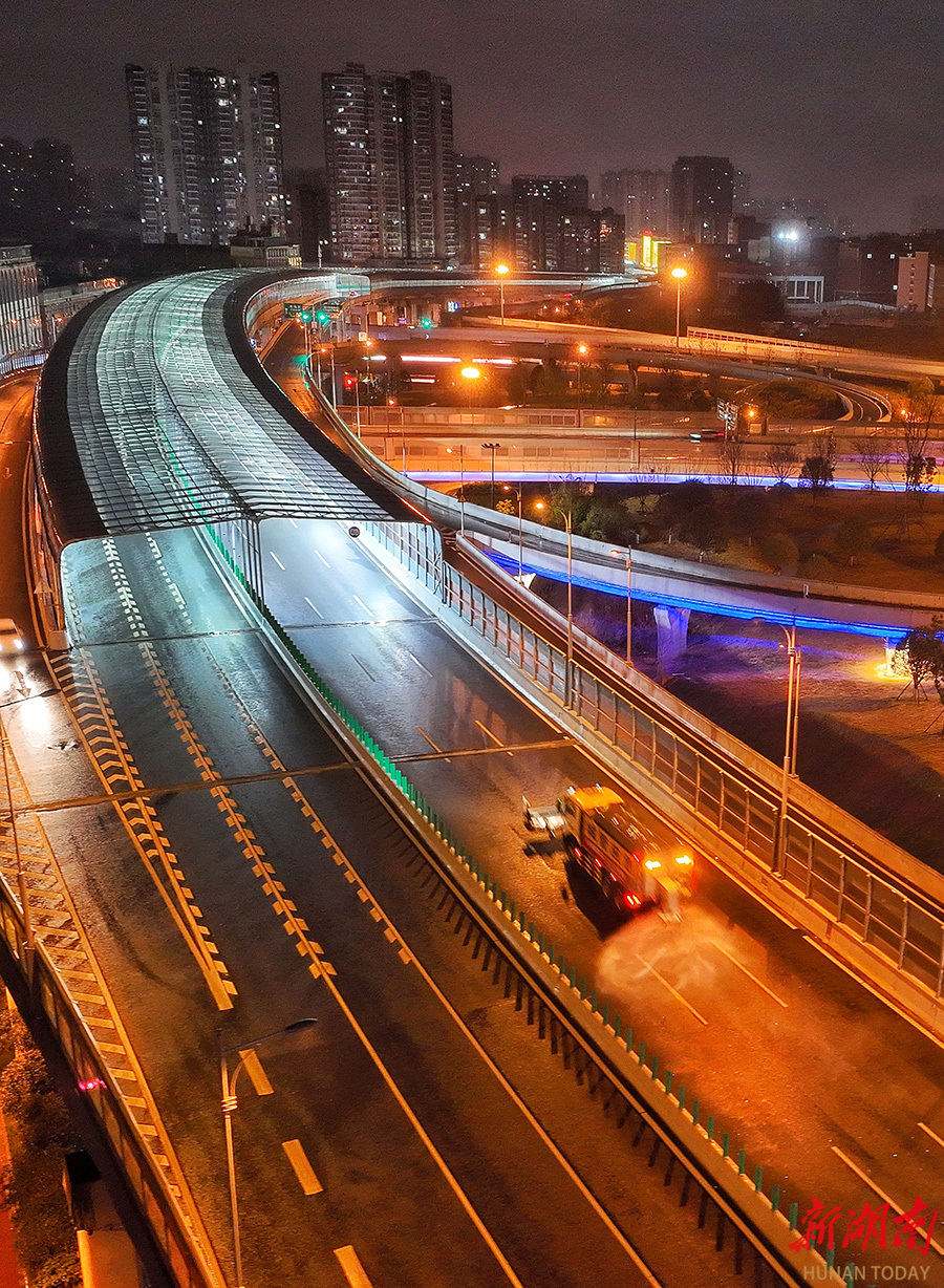 1月19日23时40分,长沙市万家丽高架桥,长沙市城市管理局组织工程车在为道路撒盐。当天,长沙市进入低温雨雪天气,该局启动防范寒潮低温雨雪和扫雪除冰攻坚工作,保障城市道路通行安全畅通。 湖南日报全媒体记者 傅聪 摄